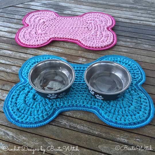 Med ett t-shirtgarn virkar du enkelt de här fina matskålsmattorna. Beskrivning finns på svenska på bautawitch.se.