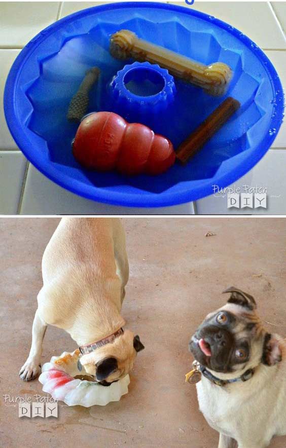Frys in några tuggben och leksaker i en sockerkaksform med vatten och lite hönsbuljong. Rolig svalka på sommardagar! Ytterligare instruktioner finns på purplepatchdiy.com