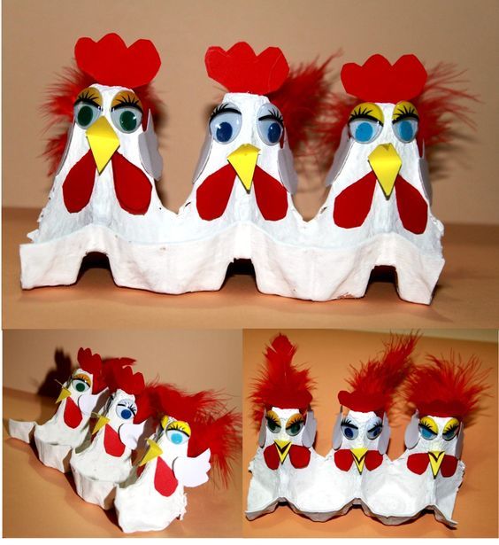Klipp ut tre toppar och behåll två bottenskålar. Måla allt vitt, använd färgat papper att göra näbb, slör, kam och vingar. Sätt fast roliga hobbyögon och fjädrar bak. Källa