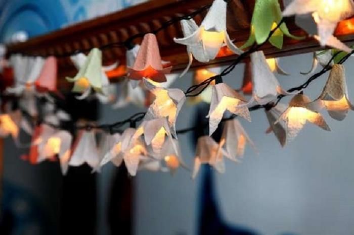 Klipp ut massa toppar och klipp ut blombladen och måla ljuskopparna i valfria färger. Gör ett hål lagom stort så du kan pressa igenom ljuset på led-slingan. Källa