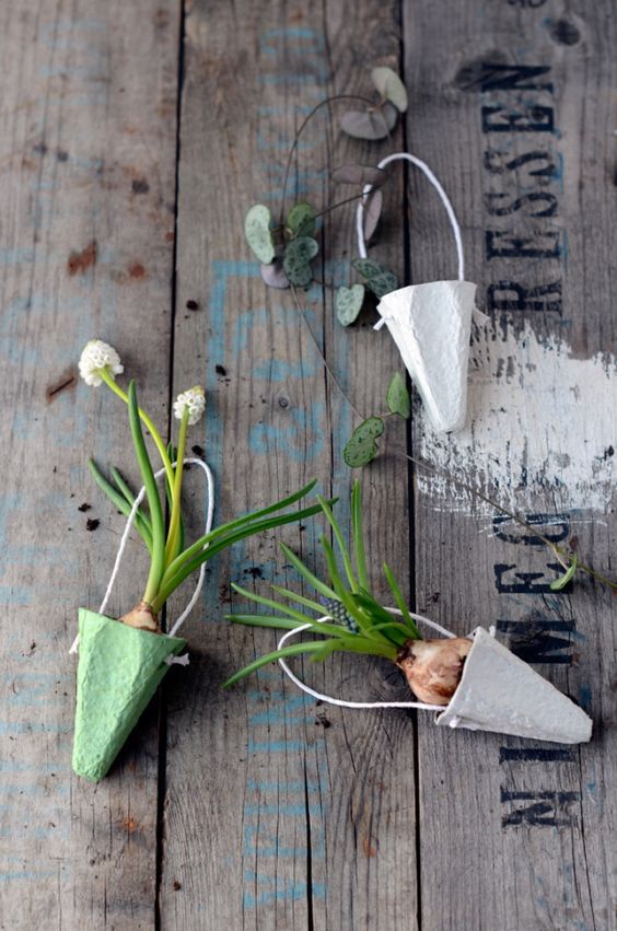 Klipp ut toppar och måla dem och sätt fast små handtag i starkare tråd. Ta en liten lök av valfri blomma och sätt i korgen. Källa