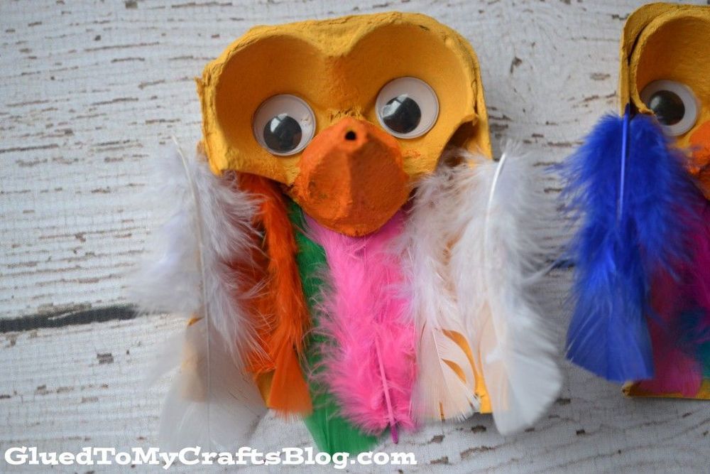Här måste du använda en kant på kartongen. Klipp ut två bottnar och en topp och måla allt gult, förutom näbben. Sätt dit stora hobbyögon och fäst långa fjädrar under kartongen. Se till att använda fjädrar som är cruelty-free. Källa