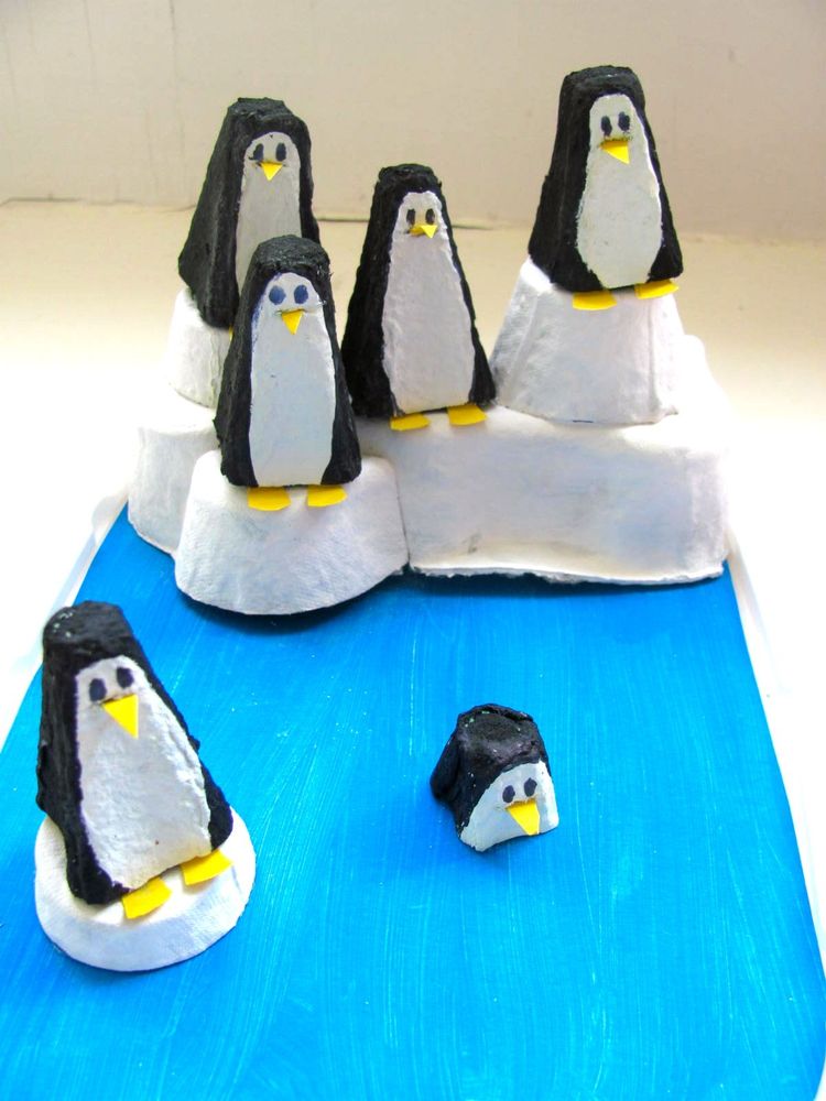Så söt är den här pingvinfamiljen. Klipp ut massa toppar och måla kroppparna och ögonen. Fäst med gult papper näbbar och fötter. Havet som pingvinerna badar i är ett big-pack-lock som är målat. Källa