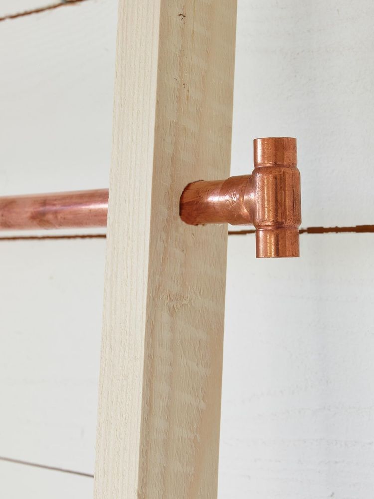 Fynda material på byggvaruhusen och fixa enkla hemmaprojekt. Här resulterade några trendiga kopparrör och sidostycken i trä i en snygg och praktiskt stege för hemmets alla rum.