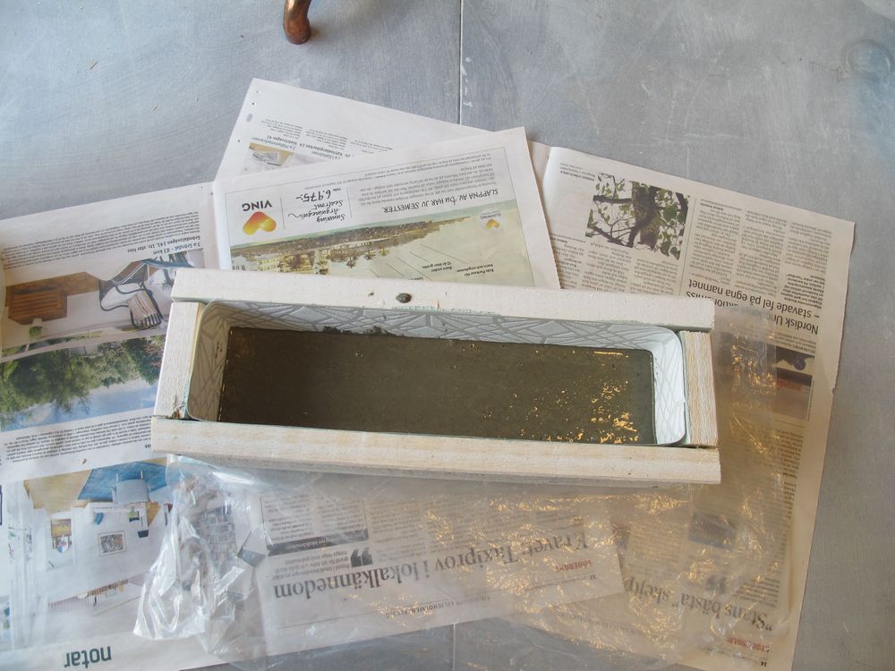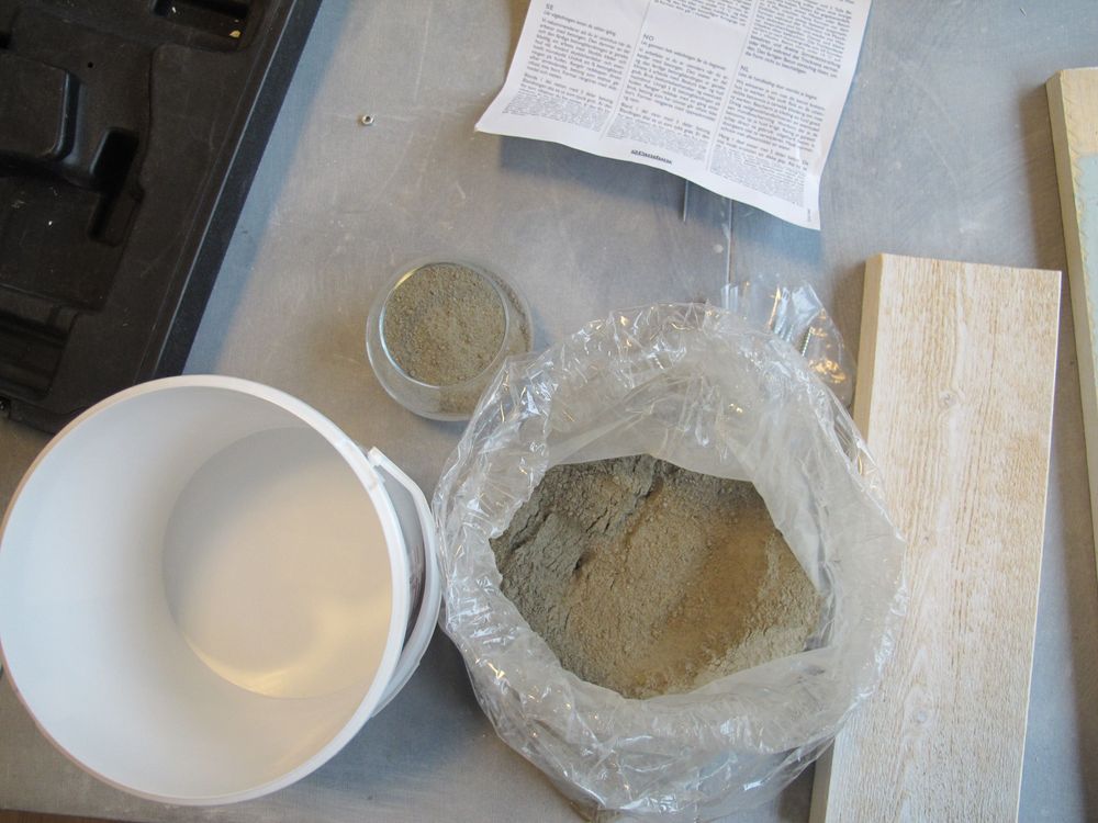 2. Bland finbetong och vatten i en bunke och rör ordentligt i ca 5 minuter. Massan ska bli som en lagom tjock gröt. Finbetong finns att köpa på byggvaruhus eller hobbybutiker. Använd skyddshandskar och förkläde.
