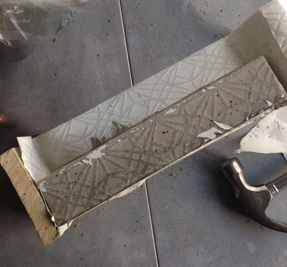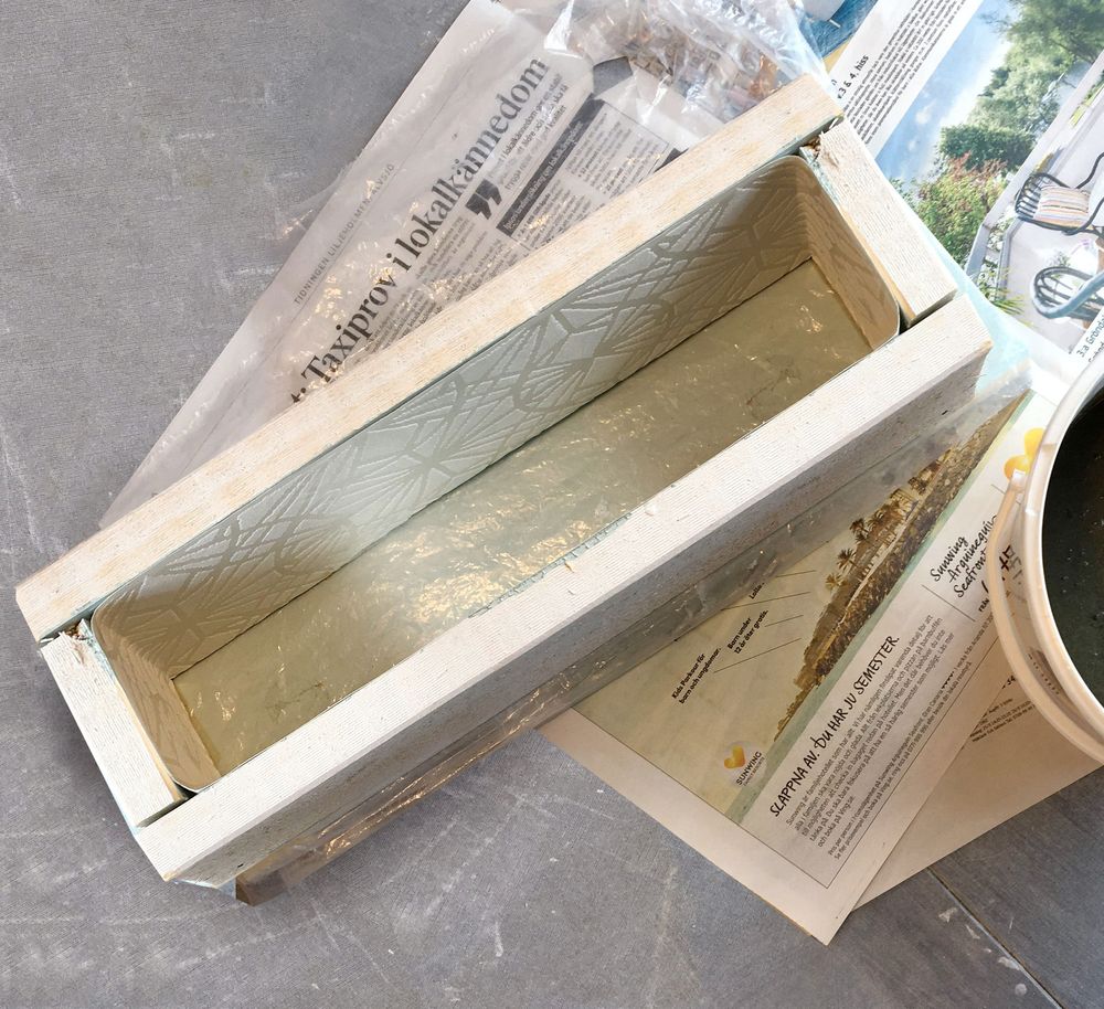 1. Börja med att bygga formen. Mät och såga alla bitar. Lägg plast på bottenbrädan innan du skruvar fast den, skruva sedan ihop hela formen. Fäst en passande strukturtapeten på insidan av formen med spraylim. Mönstret ger ett fint avtryck på ljusstaken.