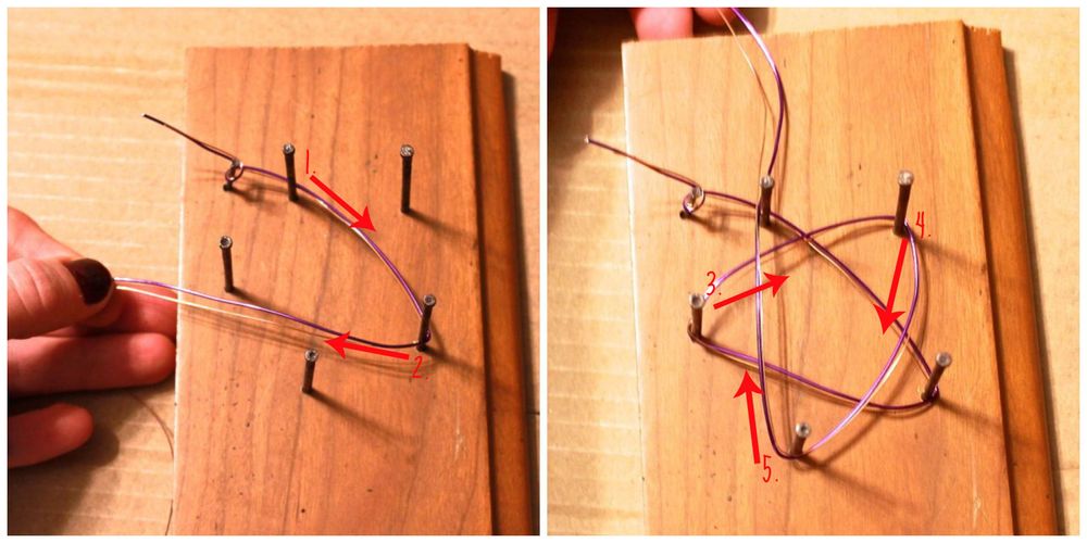 2. Fäst ståltråden runt ankarpunkten och vira sedan runt spikarna enligt bilden. Fortsätt tills stjärnan är så tjock du vill ha den.