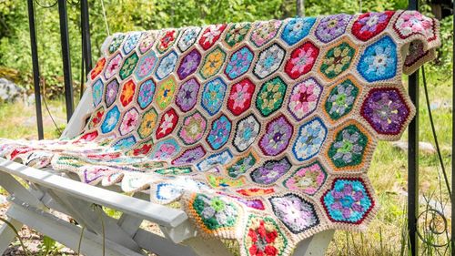 Mormorsrutor behöver inte vara just rutor. De här är sexkantiga, fyllda med blommor och hopsatta till en riktigt glad filt.