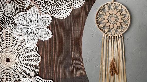 Släng inte gamla, virkade dukar. De kan bli fina drömfångare.