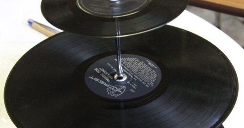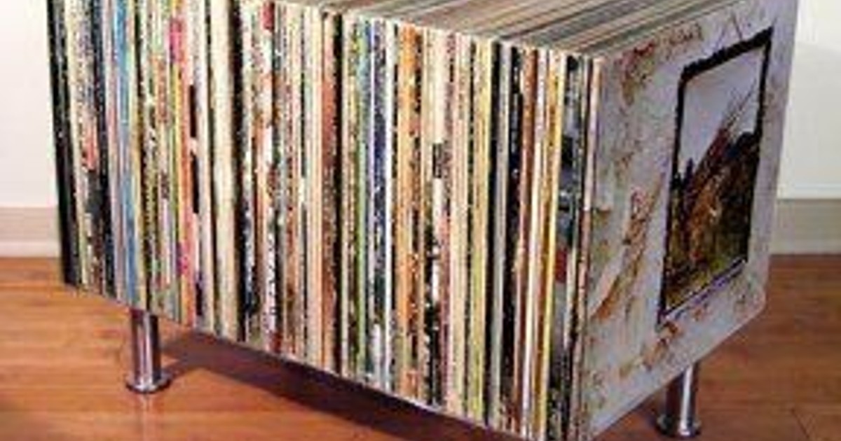 Här har kreatören pressat ihop en mängd skivor och hällt epoxy över klumpen. En något enklare modell vore kanske en kub av plexiglas fylld med skivor.
