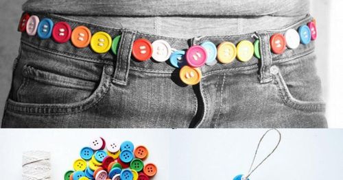 En rad med knappar i samma storlek träs ihop med stadigt bomullsgarn. En enkel ögla i slutet blir bältesknäppe.