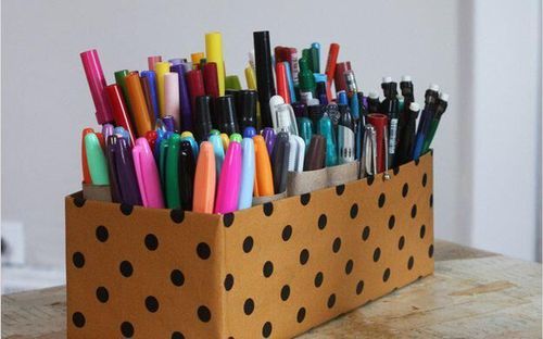 Sätt helt enkelt ett gäng tomma toarullar i en dekorerad skokartong för att hålla pennorna organiserade.
