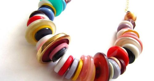 Råna familjens knappförråd och gör modesuccé. Trä knapparna på en stadig tråd. På sista biten, den som syns runt halsen, kan du skarva på en bit snygg kedja. Knyt ordentligt. Knappar är tunga grejer.