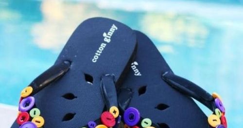 Det är dina flip flops, ingen annans. Sy fast ordentligt med knappar på fotbandet så blir det både snygga och lätta att hitta i flip flop-högen på stranden.