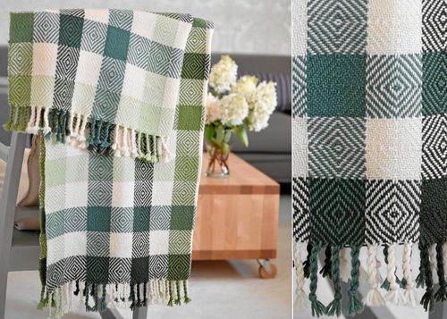 Den här varma, fina pläden är ett nöje att väva. Tekniken kallas gåsögon.