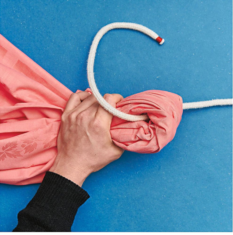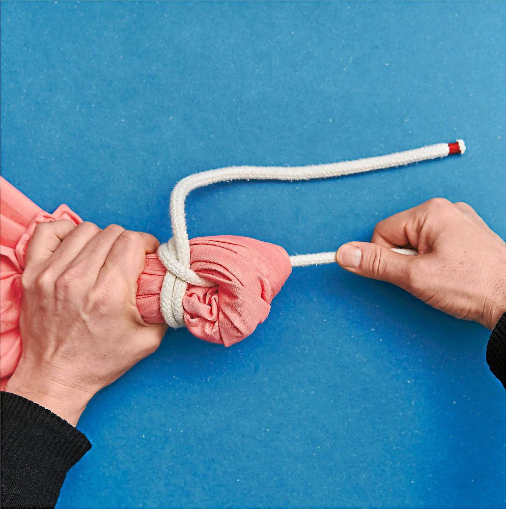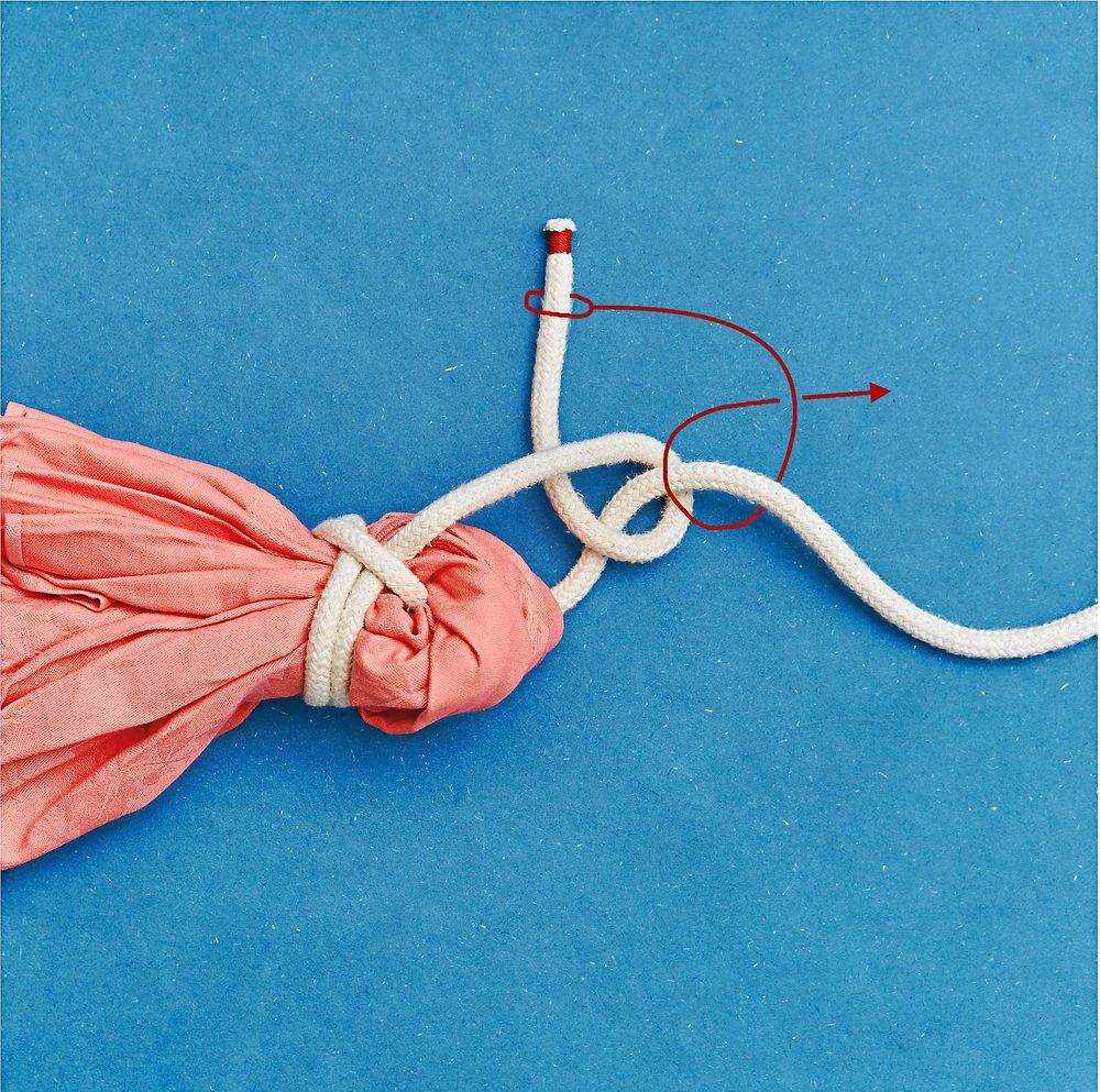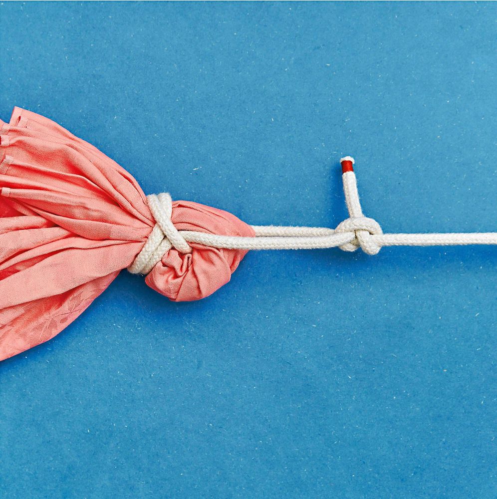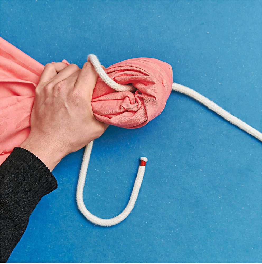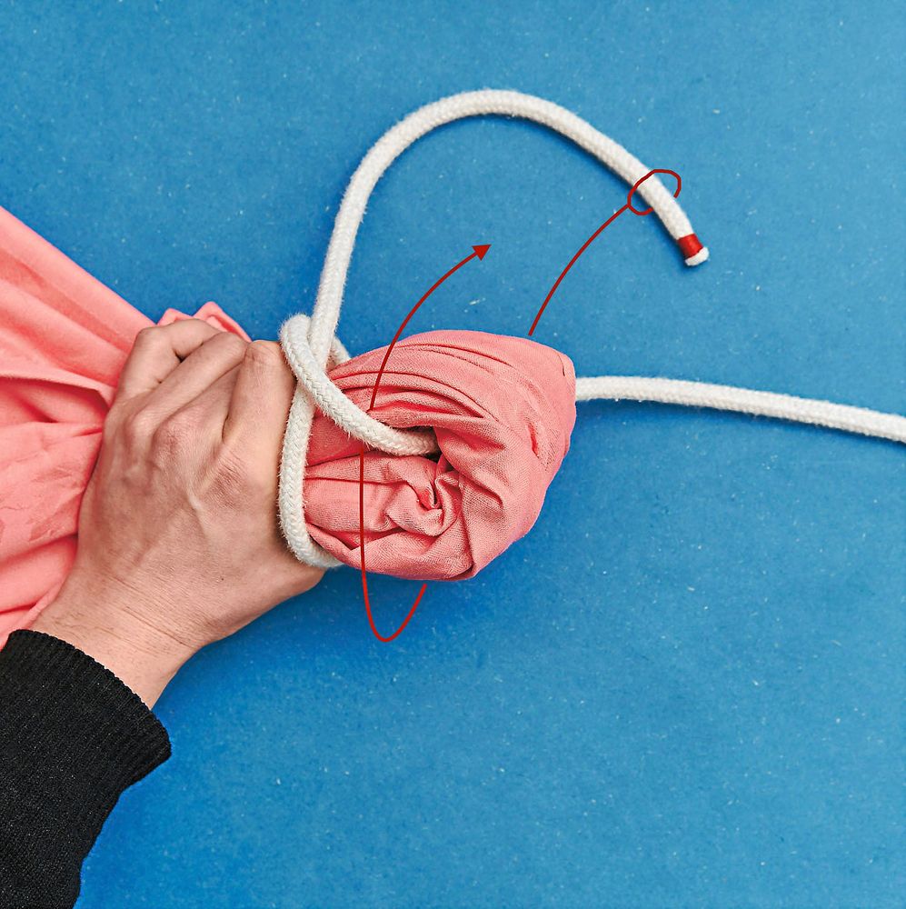 7. Dra åt. Knopen är färdig, observera att de löpande parterna på repet och det vikta tyget pekar åt samma håll. (Löpande part är den del av repet man arbetar med när man gör en knop.)