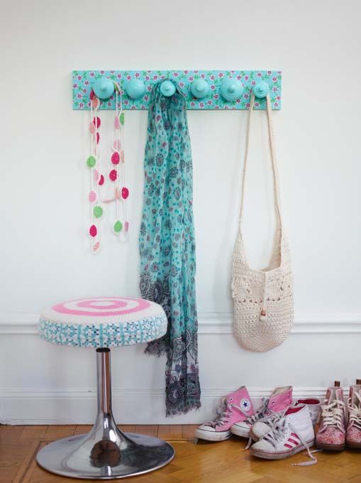 Ta vara på gamla gardinstångsknoppar och ge dem nytt liv. Tillsammans med en plankbit, färg och tapet skapar de en snygg knoppbräda till hallen.