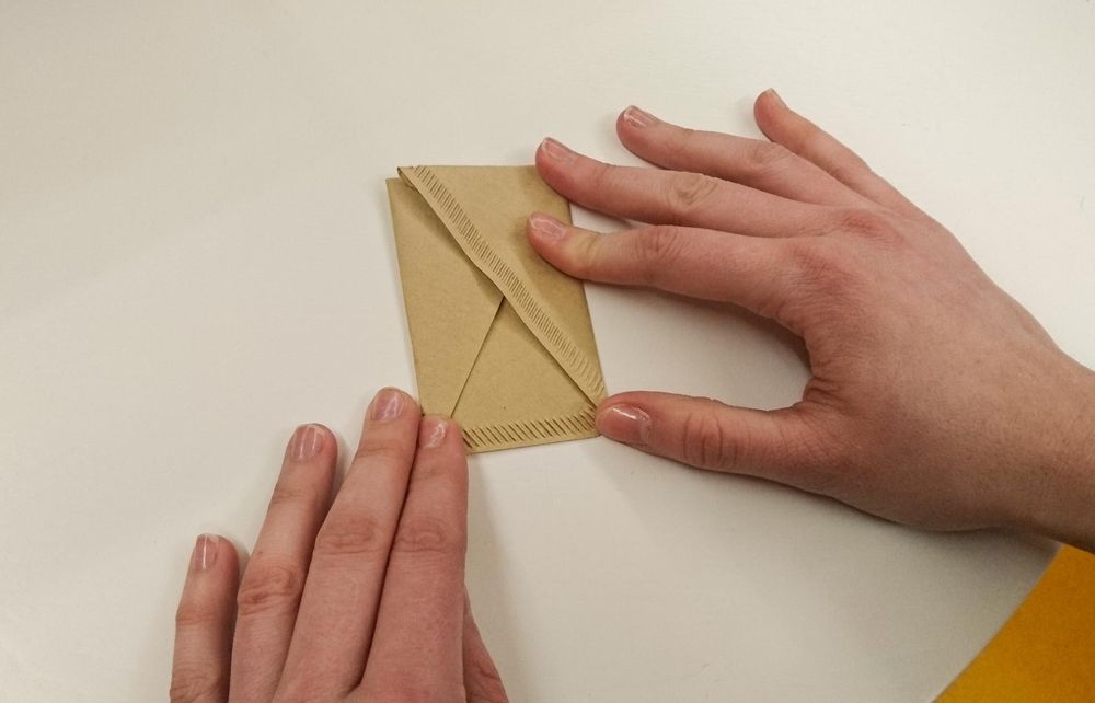 Steg 3. Vik in ena fliken mott mitten. Försök utgå från den vänstra nedersta hörnet, så att det blir en rak linje.
