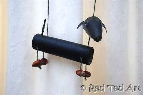 5. Skapa benen och svansen. Gör hål i hushållsrullen och trä genom ett snöre. Fäst kastanjerna som hundens fötter. Gör ett hål och fäst en liten kvist som svans.