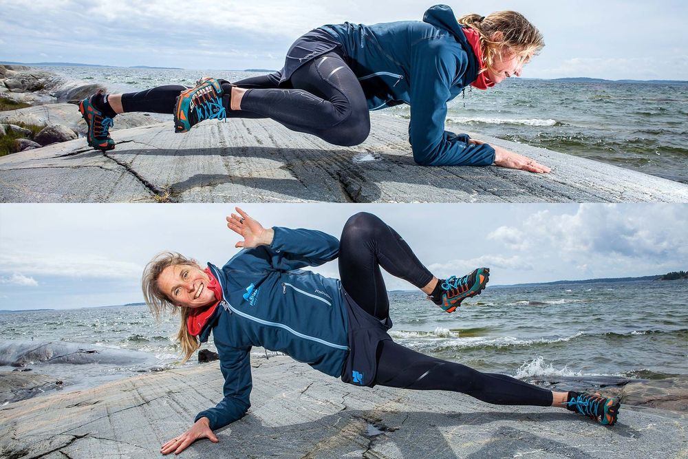 3. Gör plankan på sidan. Även här ska kroppen hållas rak. Dra eventuellt det övre knät och den övre armen mot magen. Sträck ut och börja om.