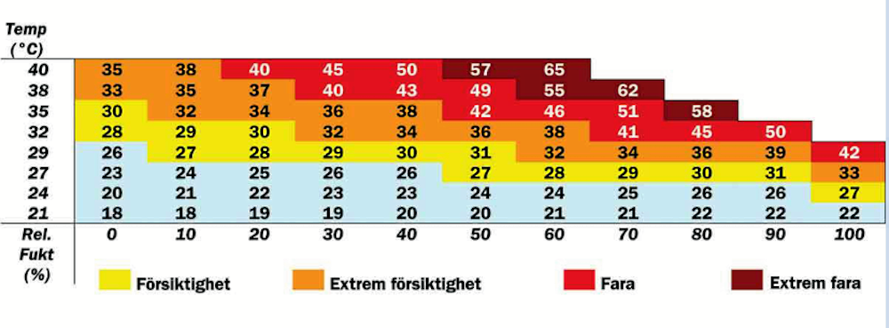 Hög luftfuktighet kan förstärka hettan till hälsofarliga nivåer. Kolla själv i tabellen!