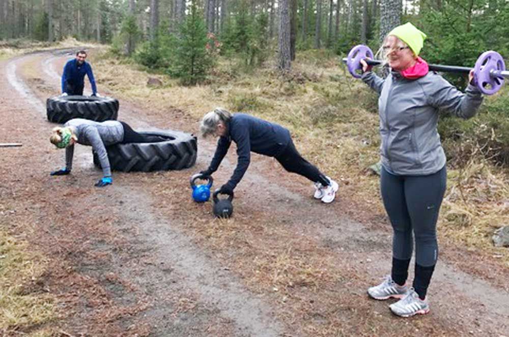 Ida har lagt till träningsredskap från gårdsmiljön. Under en bonnaträning kan hennes adepter få göra olika varianter av benböj, armhävningar och sit-ups på traktordäck – eller rent av dips längst fram på själva traktorn.