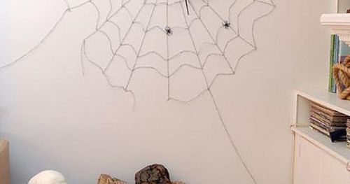 Men ett garnnystan och lite tejp fixar du enkelt det här snygga spindelnätet. Börja med att tejpa upp raka linjer som möts i mitten och drapera sedan tyget mellan stommarna. Dekorera med några plastspindlar, supersnabb halloweenkänsla!