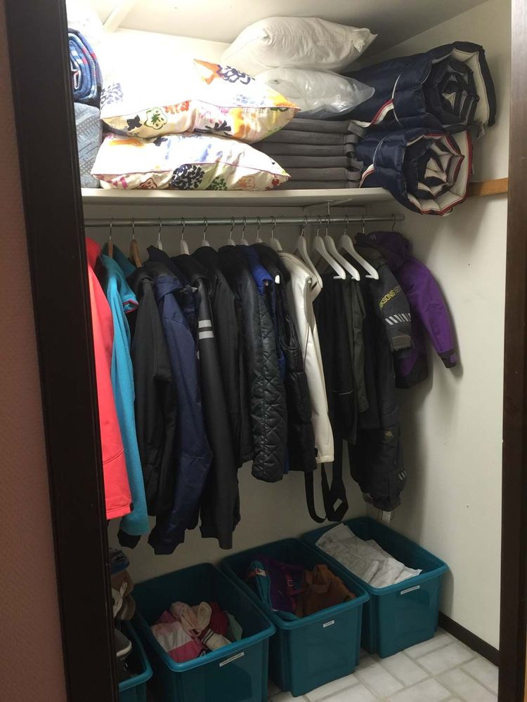 Rummet är litet, cirka fyra kvadratmeter, och här samsas säsongsprylar som skidskor och vinterjackor med tältutrustning. Golvytan är nästan osynlig och familjen har svårt att hitta det de behöver.