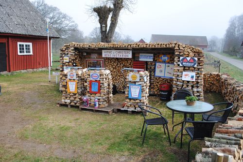 Egon Svärd har gjort vedhuggning till en konst. I år har han byggt en hel bensinstation av sin ved och det lär bli gott om nyfikna besökare även denna gång.
