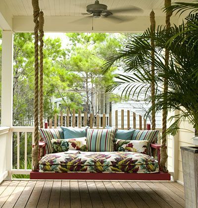 Såga av benen på en uttjänt träsoffa och häng upp med kraftigt rep på stadiga reglar under verandataket. Källa