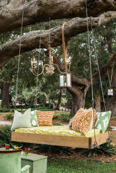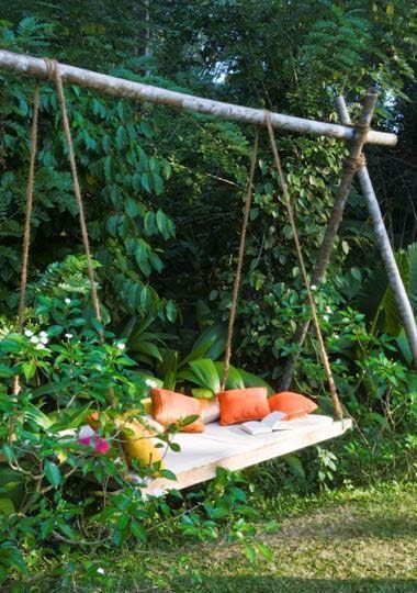 Sommarens skönaste uterum fixar du under trädet. En trälåda, en madrass, några kuddar och kraftiga kedjor gör jobbet. Källa
