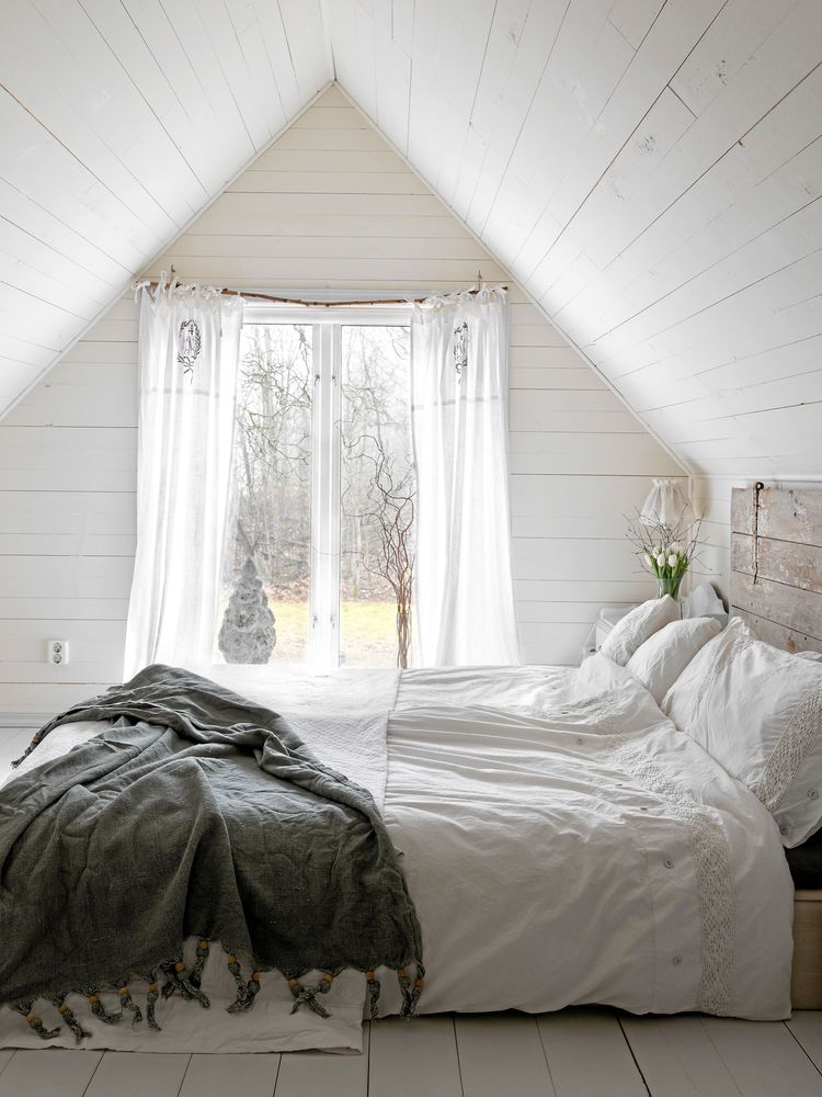 En gammal kallvind har gjorts om till sovrum. Nya fönster, som i princip går från golv till tak, har satts in och ger tillsammans med det spetsiga taket en näst intill sakral känsla. Den fina sängaveln är en gammal ladugårdsdörr.