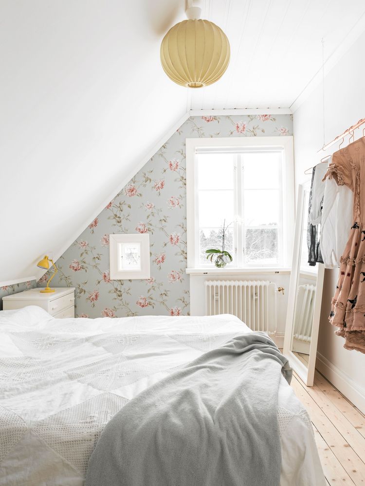 Vackert lantligt med trägolv och blomstertapeter. Klädhängaren i koppar är inte bara fin att se på – den skapar också praktisk förvaring där det finns ont om plats för ett skåp.