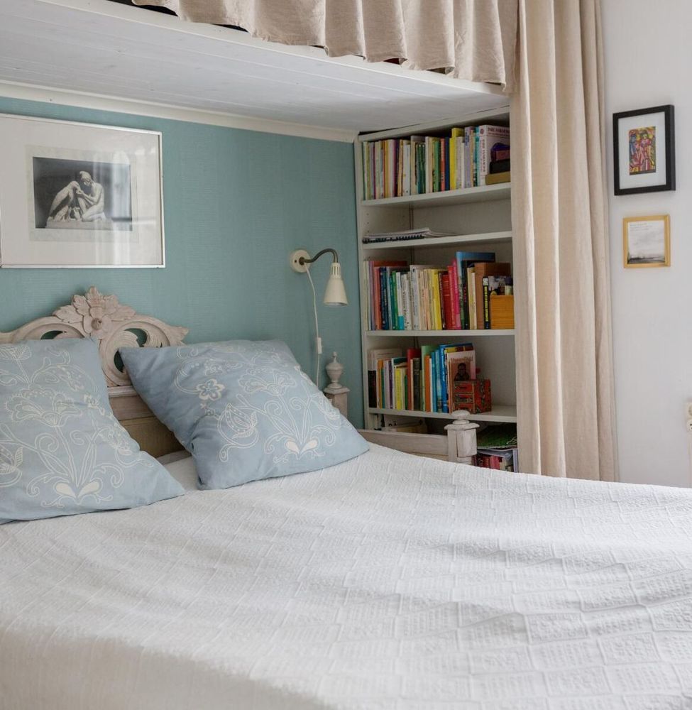 Finns det något bättre än att krypa ner i sängen och läsa? I det här gamla torpet har böckerna en given plats.