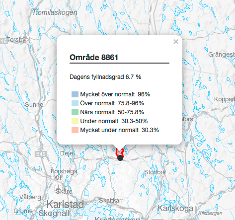 Gå in på sidan och zooma in på ditt område och välj ”små vattenmagasin” i kartans meny. Klickar du direkt på kartan visas SMHIs beräknade grundvattenvärde för det rödmarkerade området tillsammans med fakta om vad som anses vara normalt, högt eller under det normala.