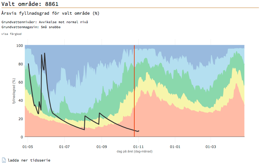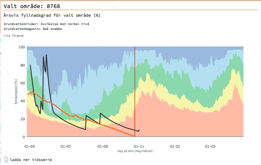 Här är vi nere på detaljnivå och den som har en brunn nära mätpunkter kan skatta sig lycklig för varningen. Den röda kurvan är på väg att smälla i botten. Det betyder att vattenbristen är nära på allvar. Dags att spara på vattnet.