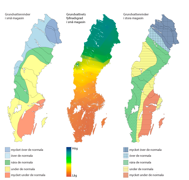 SGU (Sveriges Geologiska Undersökning) ger varje månad ut en karta över grundvattennivåerna i Sverige. Värdena utgår från 300 mätpunkter över landet och mätvärdena jämförs med data ända från 1970-talet för att se om nivåerna är normala, höga eller låga.