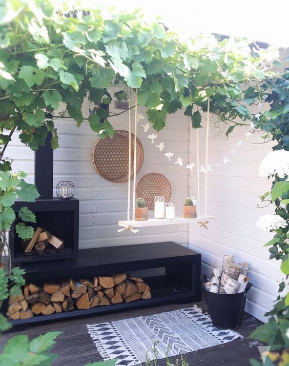 Sittplats och vedförvaring på samma gång. En söt hängande hylla blir ett fint blickfång. Källa