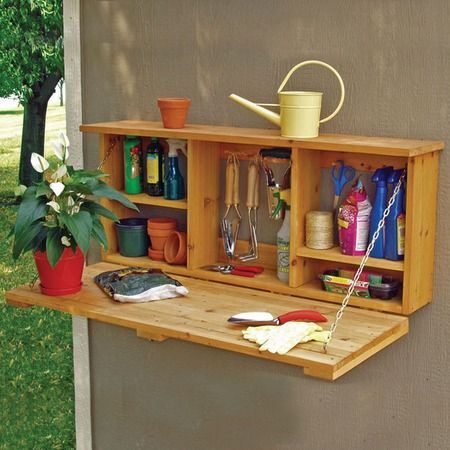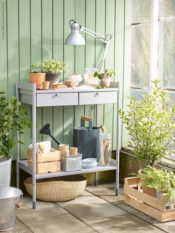 Ett bord och en ram med krokar ovanför kan bli trädgårdens trivsammaste planteringshörna. Källa