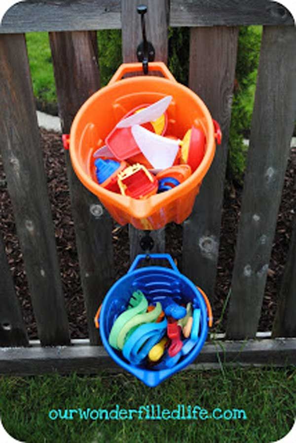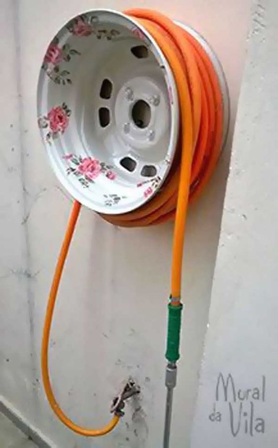 Har du varken redskapsbod eller garage kan det funka med krokar på väggen. Eller som här på en dörr. Helst med ett litet tak över. Källa