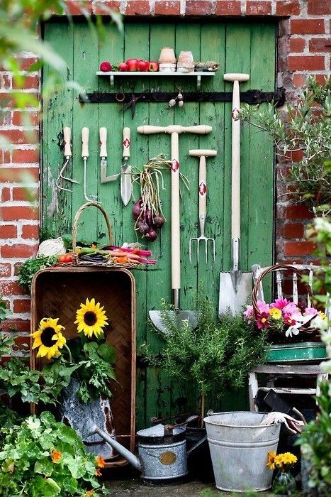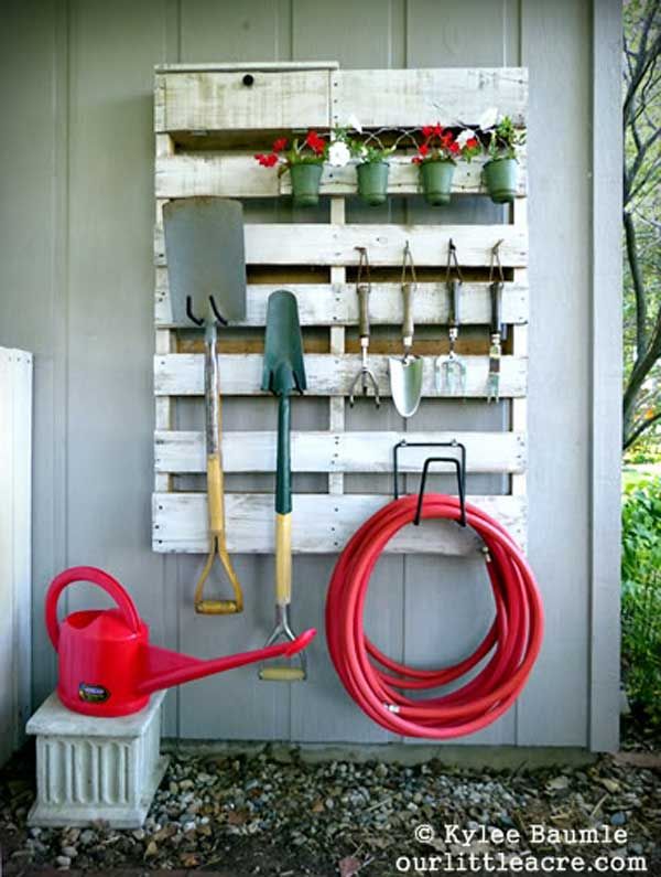Enkelt och genialiskt med en kratta som hängare för redskap. Källa