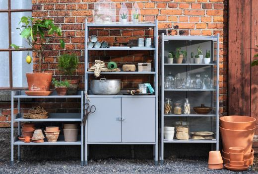 Ikea har en serie med förzinklade stålhyllor som rymmer mycket av trädgårdens prylar och pryttlar.