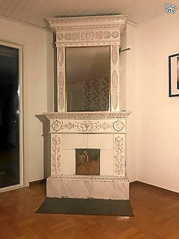 Denna kakelugn kräver sitt rum, kan man säga. Dels är den stor i sitt omfång, men med en så stor spegel på sidan så vill man ju att de rätta detaljerna ska speglas i den. Kakelugnen är daterad till 1880-talet enligt köparen och kommer ursprungligen från tillverkaren Rörstrand.