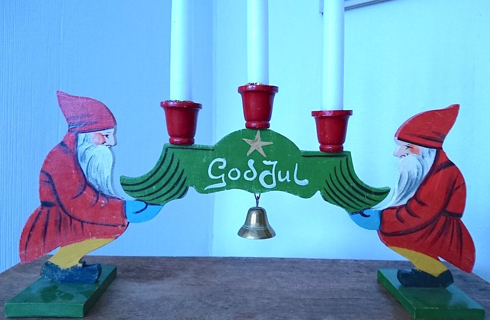 Signaturen Gerd hade tre fina ljusstakar - en med två tomtar som håller upp en gren med tre ljushållare på samt två tomtar som står ensamma med var sitt ljus.