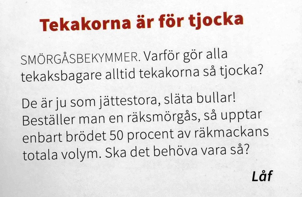 – Det är en väldigt bra fråga. Kanske att det är så att vi är vana att läsa så tillrättalagda svar, att allt ska var så perfekt. I tidningen är vi vana att det viktiga lyfts fram men så kommer en insändare om att tekakor är för tjocka till exempel. Det blir en väldig kontrast som är rolig på något sätt, säger hon.