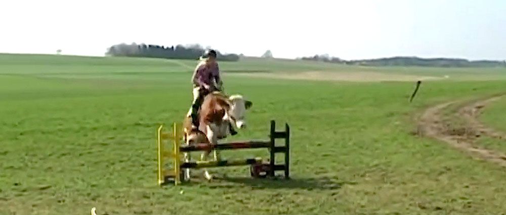 Här kan man snacka skickliga ryttare! Att få en sävlig ko till att vilja skutta runt i hagen och ta sats över hopphinder. Men det går. Kolla in Regina Myers från Tyskland på bilden, som när hon inte fick en häst istället tränade dressyr med en ko.