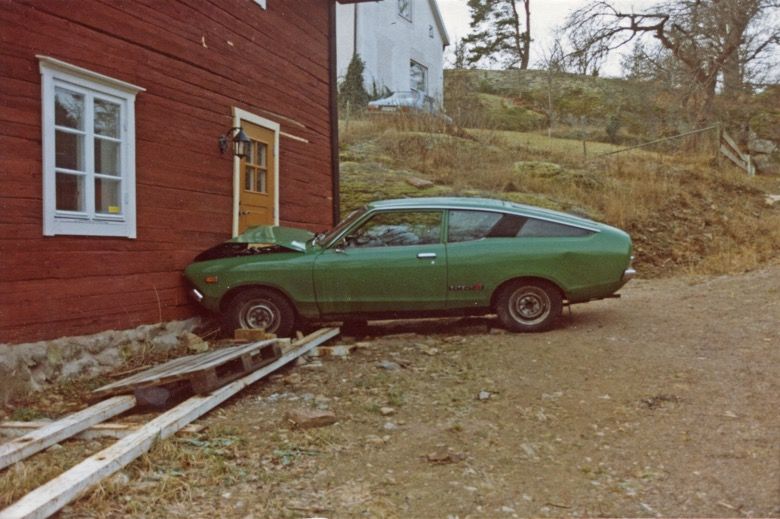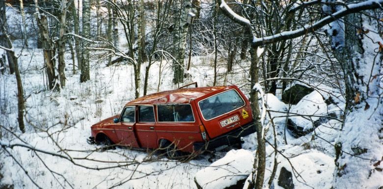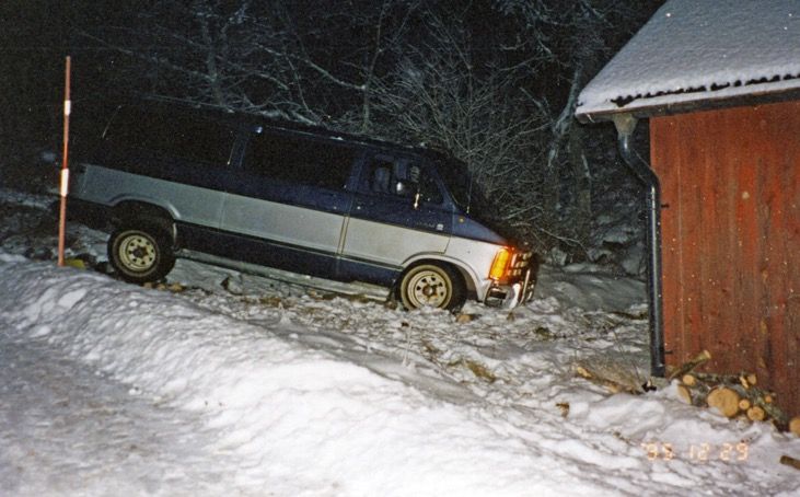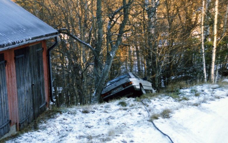 1990-talet. Havererad bil efter avåkning, men vedboden klarar sig.