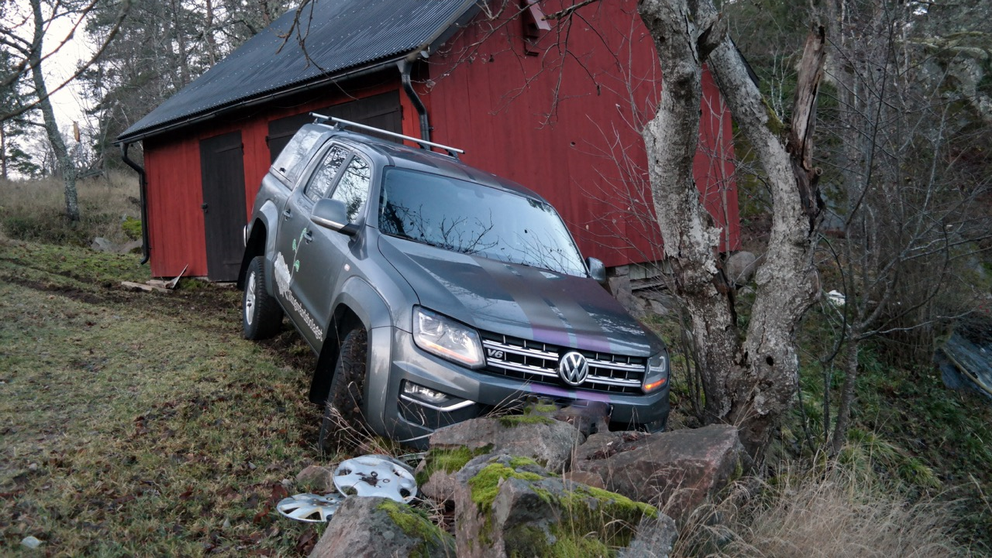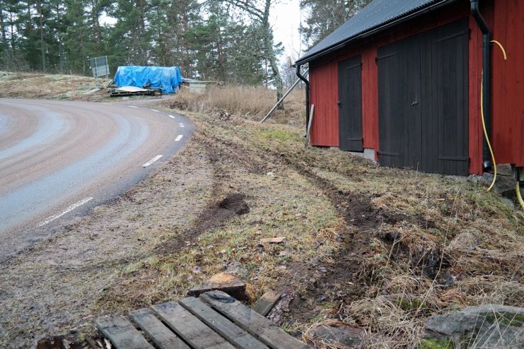 2016. Spåren efter en avåkning i februari. Bilföraren smet utan att bry sig om skadorna.