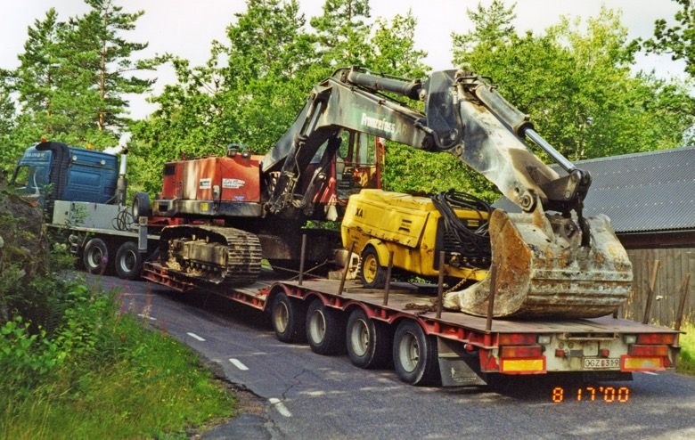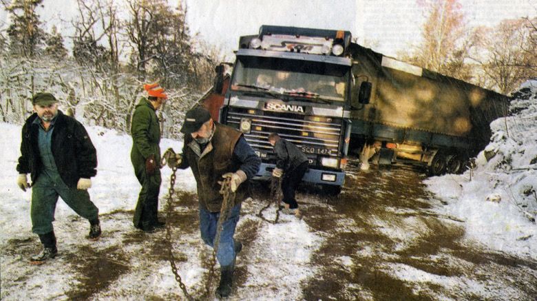 1999. Lastbil bärgas, som har hämtat granit, men kört fast i backen.
