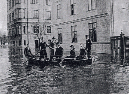 Paraplyväder är ingenting. I april år 1900 var Uppsala betydligt blötare än vanligt. Fyrisån steg så mycket att man kunde åka båt längs Skolgatan. Gänget på bilden är ute och åker den 18 april, drygt 10 dagar före Valborg.